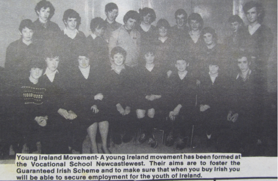 The Young Ireland Association was set up in Dublin in 1983 by a group of students who felt the need to highlight the importance of buying Irish made goods in prefernce to imported goods. A branch was set up in our school and the officers are Chairman: Dermot Cahill. Vice chairperson: Teresa Scully. Secretary: Marie Hoyne. PRO: Michael Mulchay. Adult Co-ordinator: Mr. Michael Nash. The main aim is to promote the sale of Irish goods which are competitive in price and quality with imported goods. Iif every household spent just one pound more on Irish goods each week, it would create two thousand new jobs. So please shoppers, take note of the name of the country in which the items are made and then choose the ones with the name ‘Made in Ireland’ for all our sakes.
